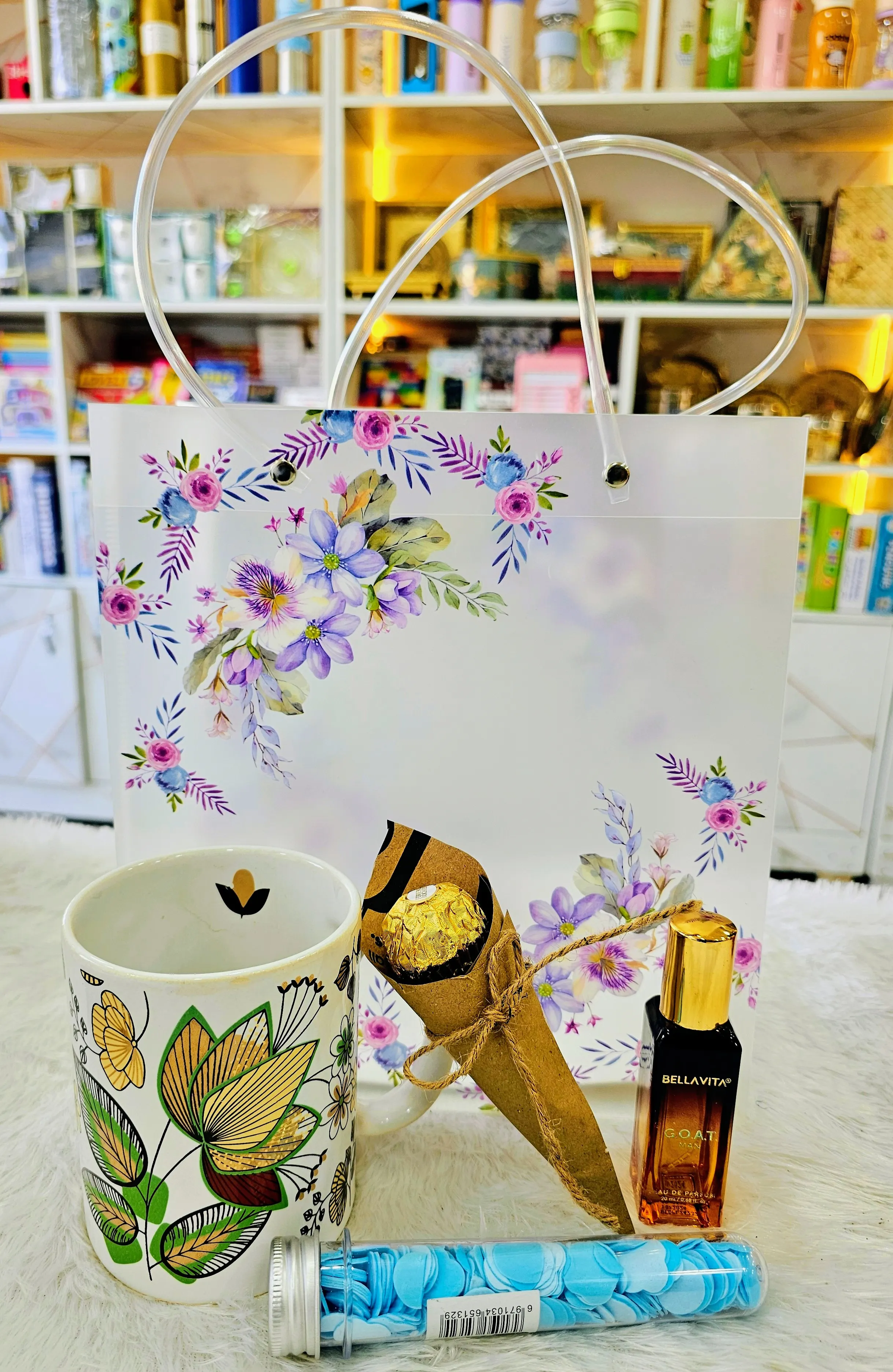 A thoughtful and versatile corporate gifting set designed to delight. This combo includes a premium ceramic mug, a mini luxury perfume, a Ferrero Rocher chocolate cone, and a tube of soap tissues for convenient hygiene on the go.