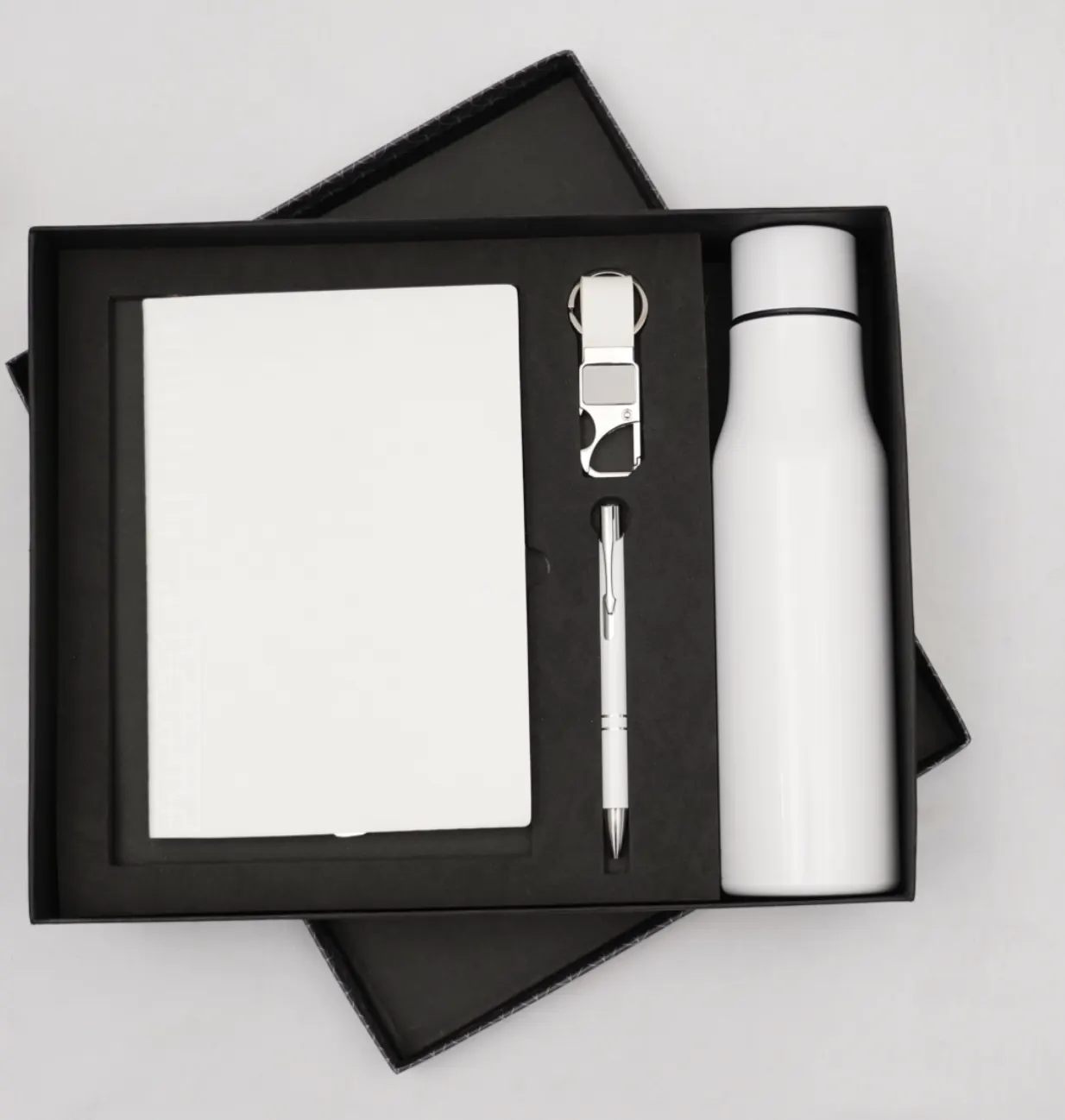 Make a lasting impression with this classy all-white premium gift set featuring a sleek notebook, metallic pen, stainless steel vacuum bottle, and a stylish keychain. Perfect for corporate events, employee appreciation, festive gifting, and brand promotions. Modern, minimalistic, and highly functional — a gift that reflects purity, professionalism, and sophistication.