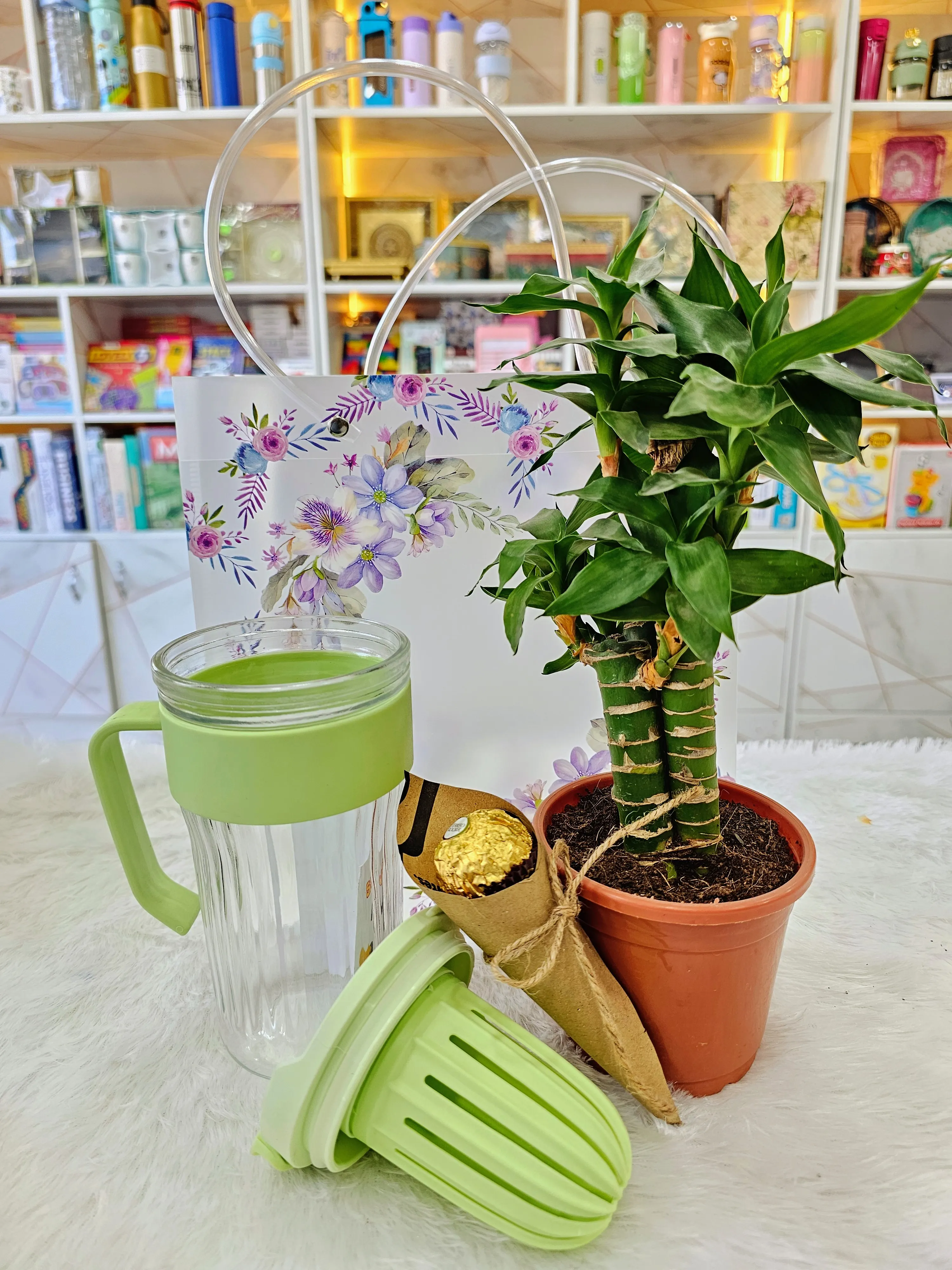 A refreshing and thoughtful corporate gifting combo designed to promote wellness and positivity. This set includes a fruit infuser mug, a plant symbolising growth and good fortune, and a Ferrero Rocher chocolate cone for a sweet finish.
