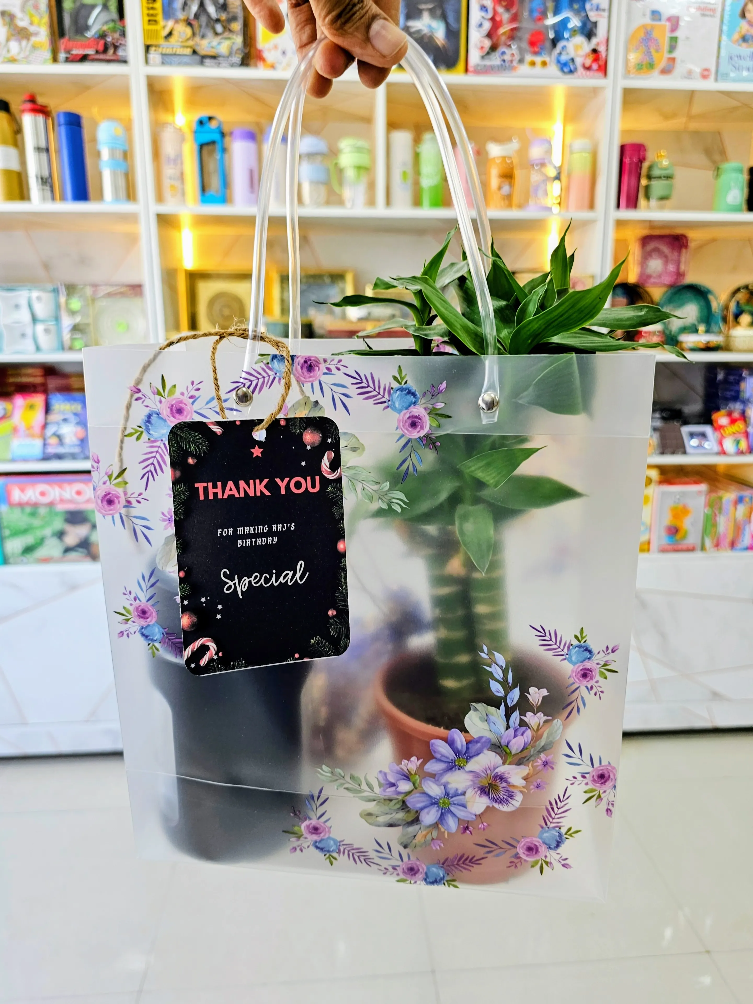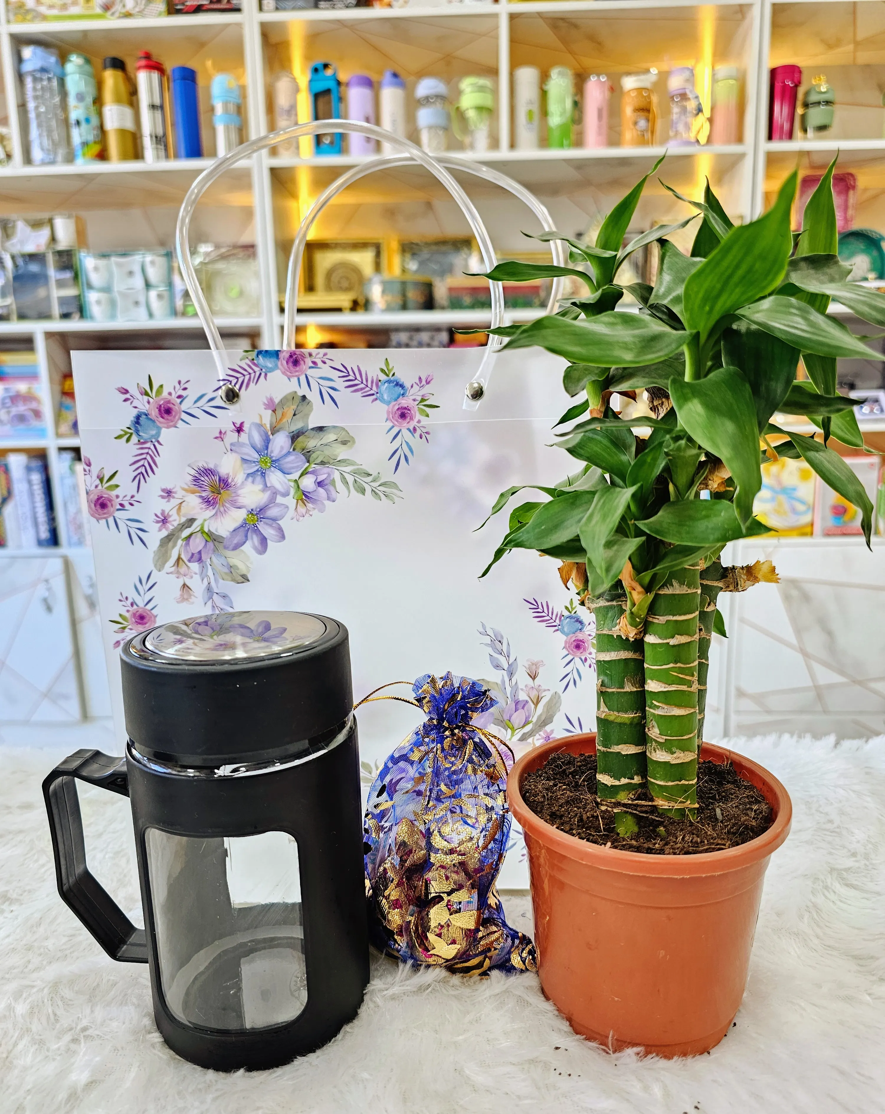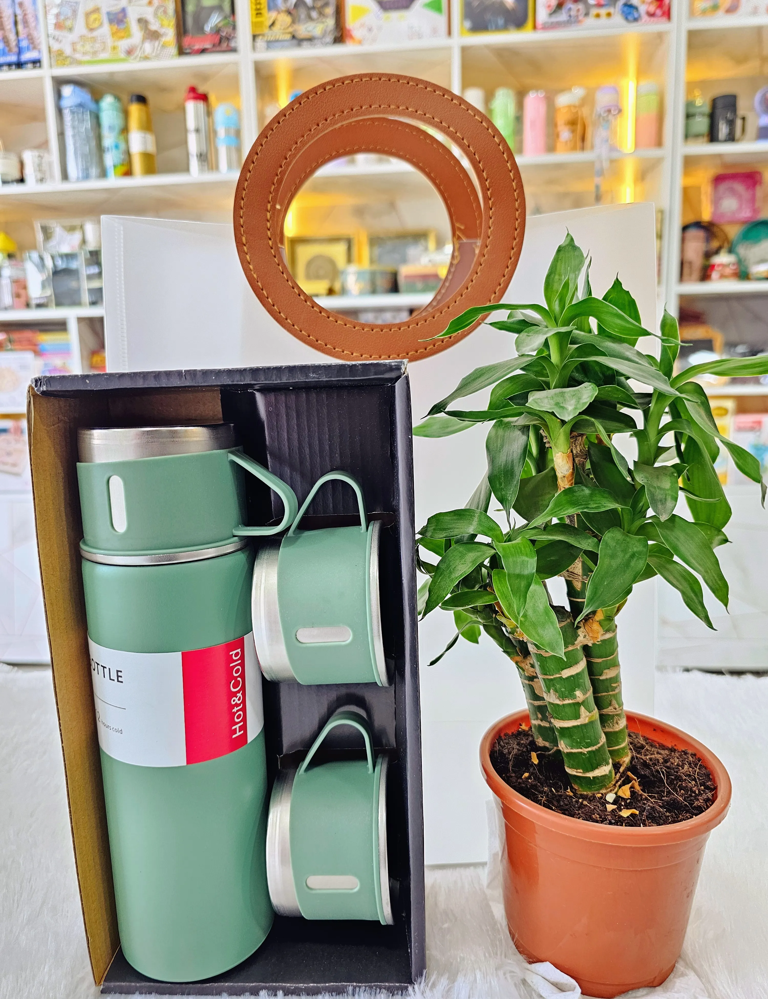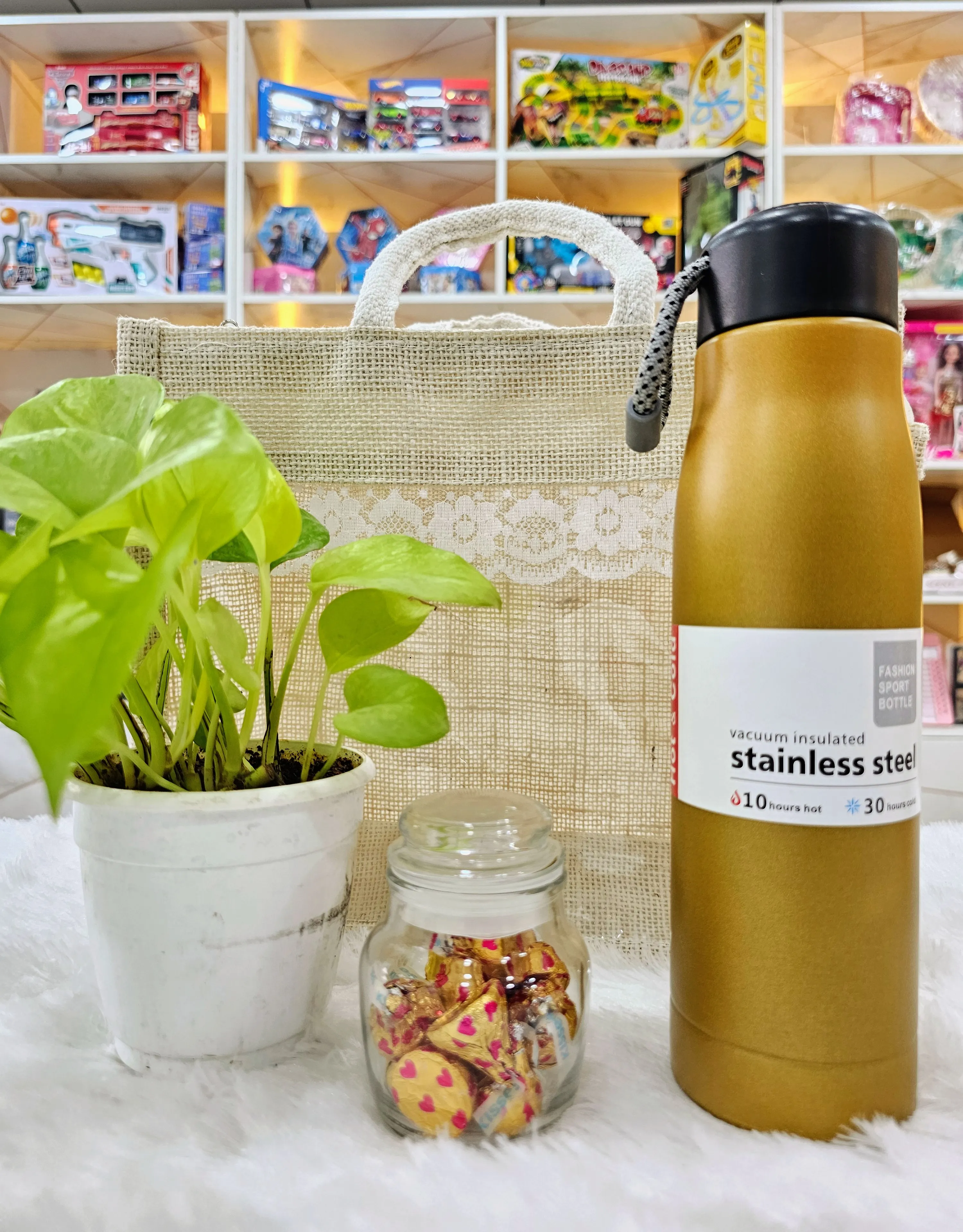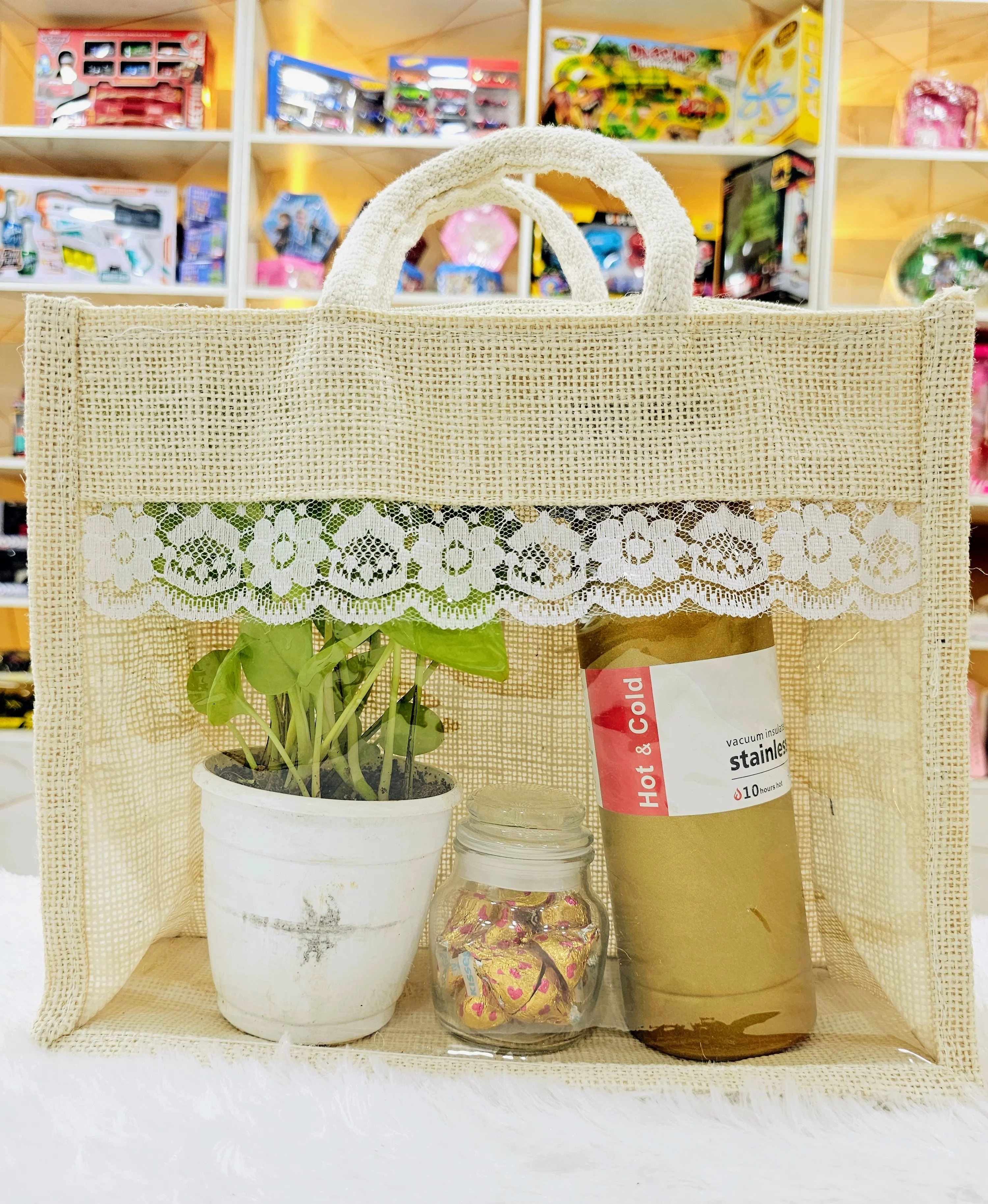 A classy and thoughtful return gift combo featuring a stainless-steel vacuum flask (keeps drinks hot for 10 hours & cold for 30 hours), a cute chocolate jar, and a fresh green money plant packed beautifully in a jute lace gift bag. Perfect for birthdays, housewarmings, corporate events, and festive gifting! Elegant, useful, and guaranteed to impress 🎁💛