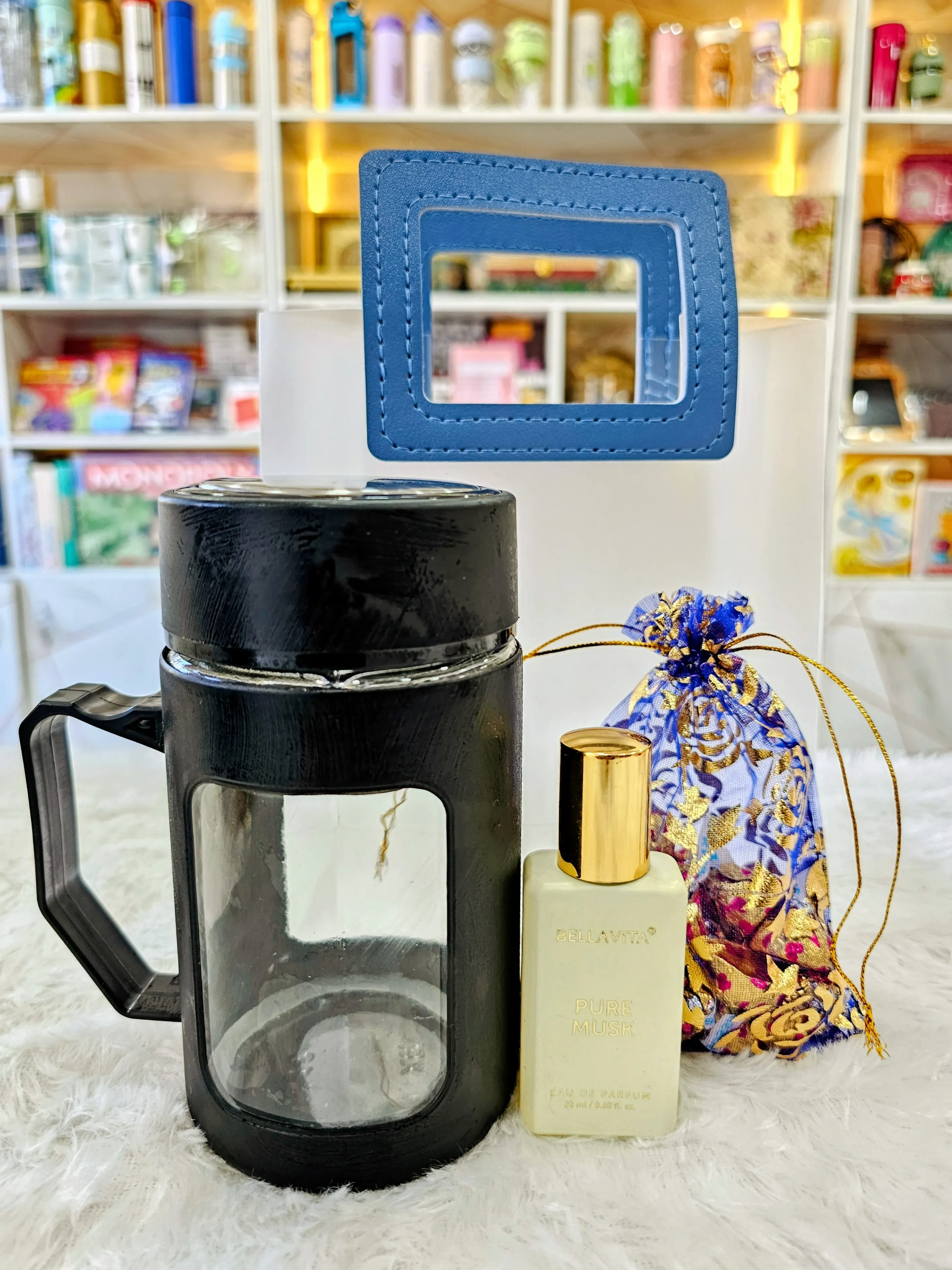 A stylish and thoughtful corporate gifting set featuring a durable glass mug, a mini premium perfume, and a decorative potli filled with assorted chocolates. This combo offers a perfect balance of utility, fragrance, and sweetness.