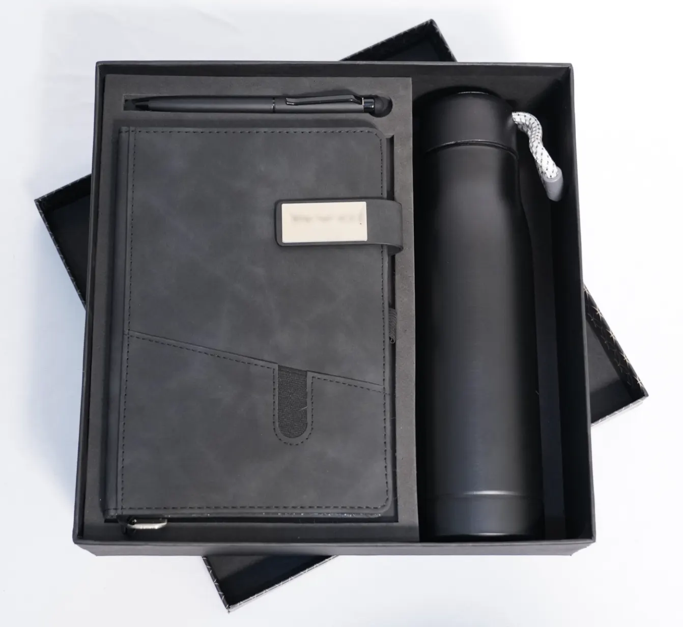 A sleek and stylish corporate gifting choice designed for modern professionals. This set includes a premium leather-textured notebook with a metal nameplate, a matte-finish thermal bottle, and a matching executive pen — all in an elegant black theme. Ideal for client gifting, employee onboarding, festive giveaways, and brand promotions. Minimalistic, premium, and irresistibly classy.