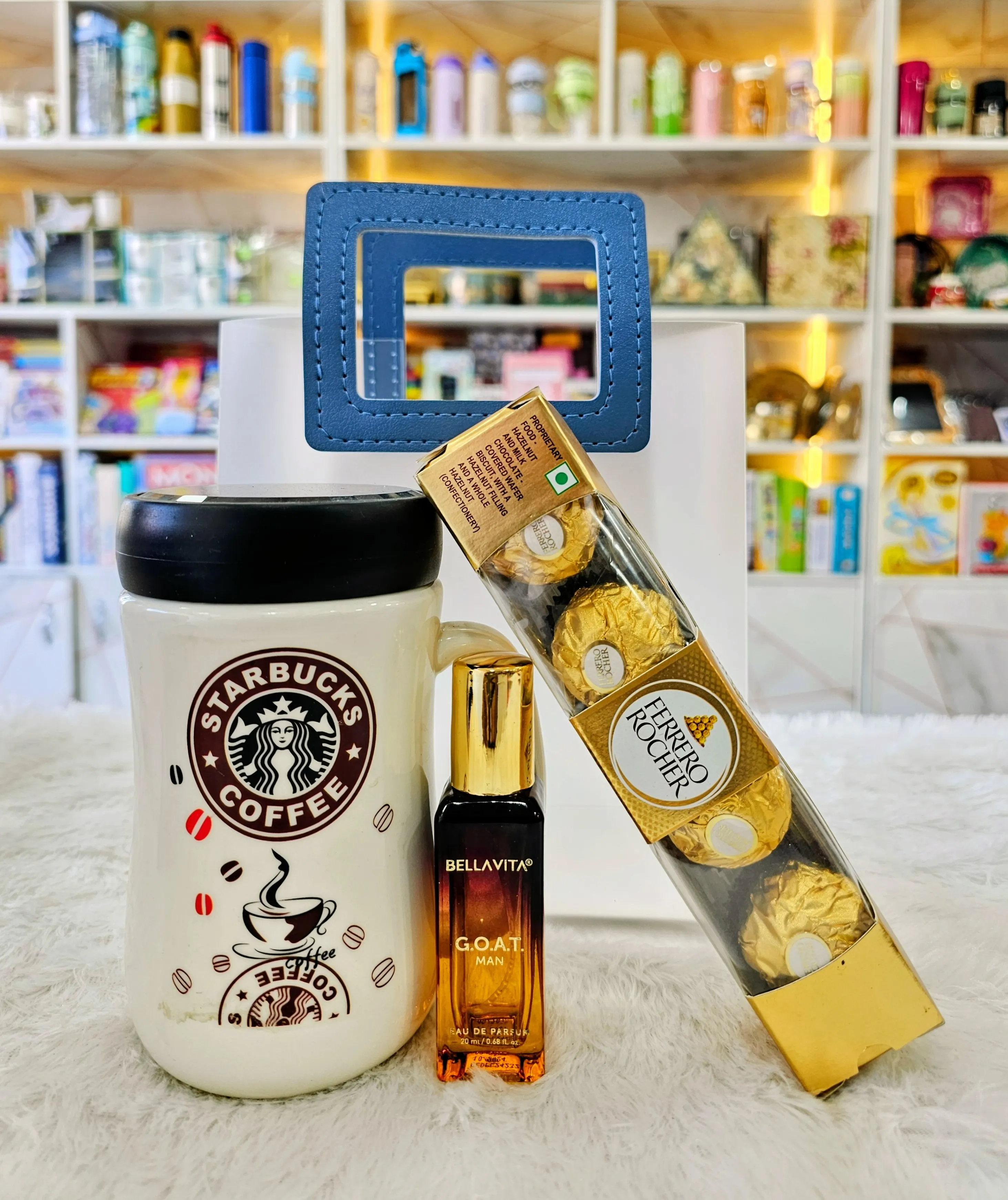 A classy and universally appealing corporate gifting set. This combo includes a premium ceramic mug, a mini perfume, and a pack of Ferrero Rocher chocolates, offering a perfect mix of utility, fragrance, and indulgence.