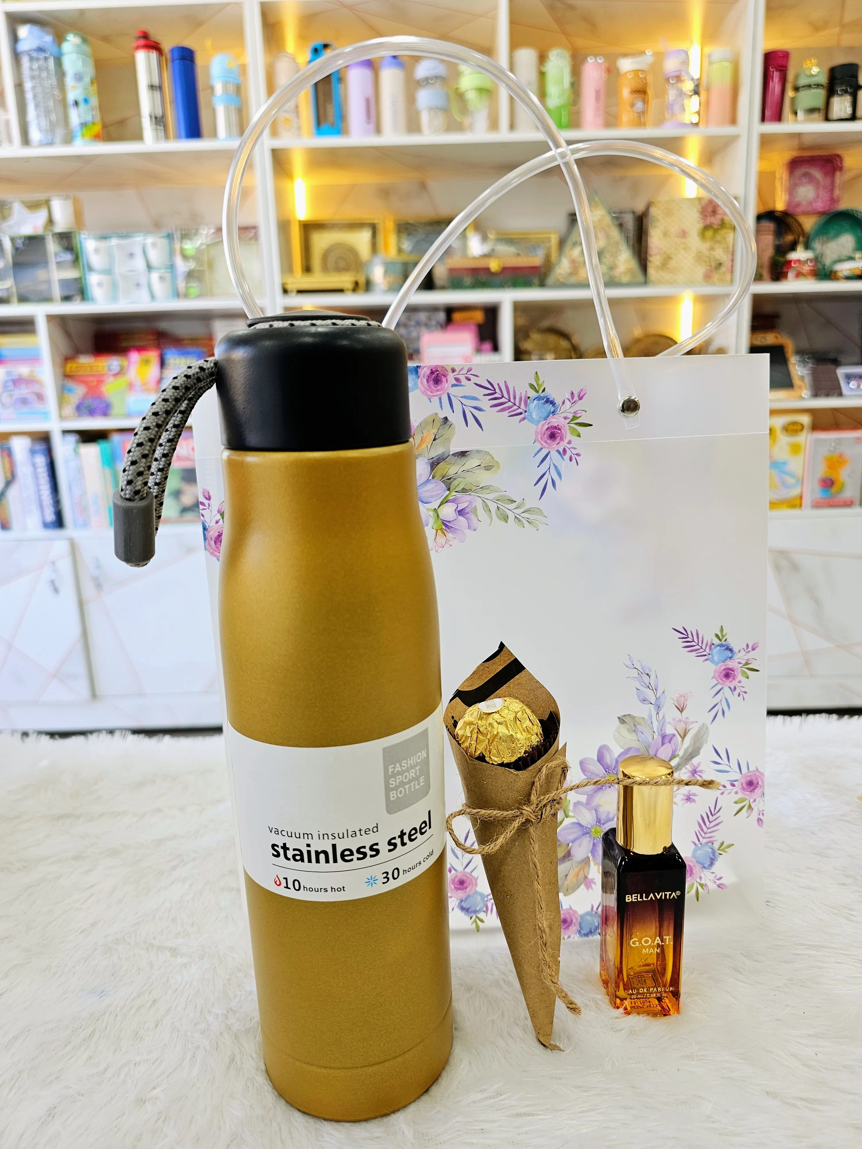 A premium and impressive corporate gifting combo crafted for a luxurious experience. This set includes a gold vacuum-insulated stainless-steel bottle, a mini luxury perfume, and a Ferrero Rocher chocolate cone for a sweet finishing touch.