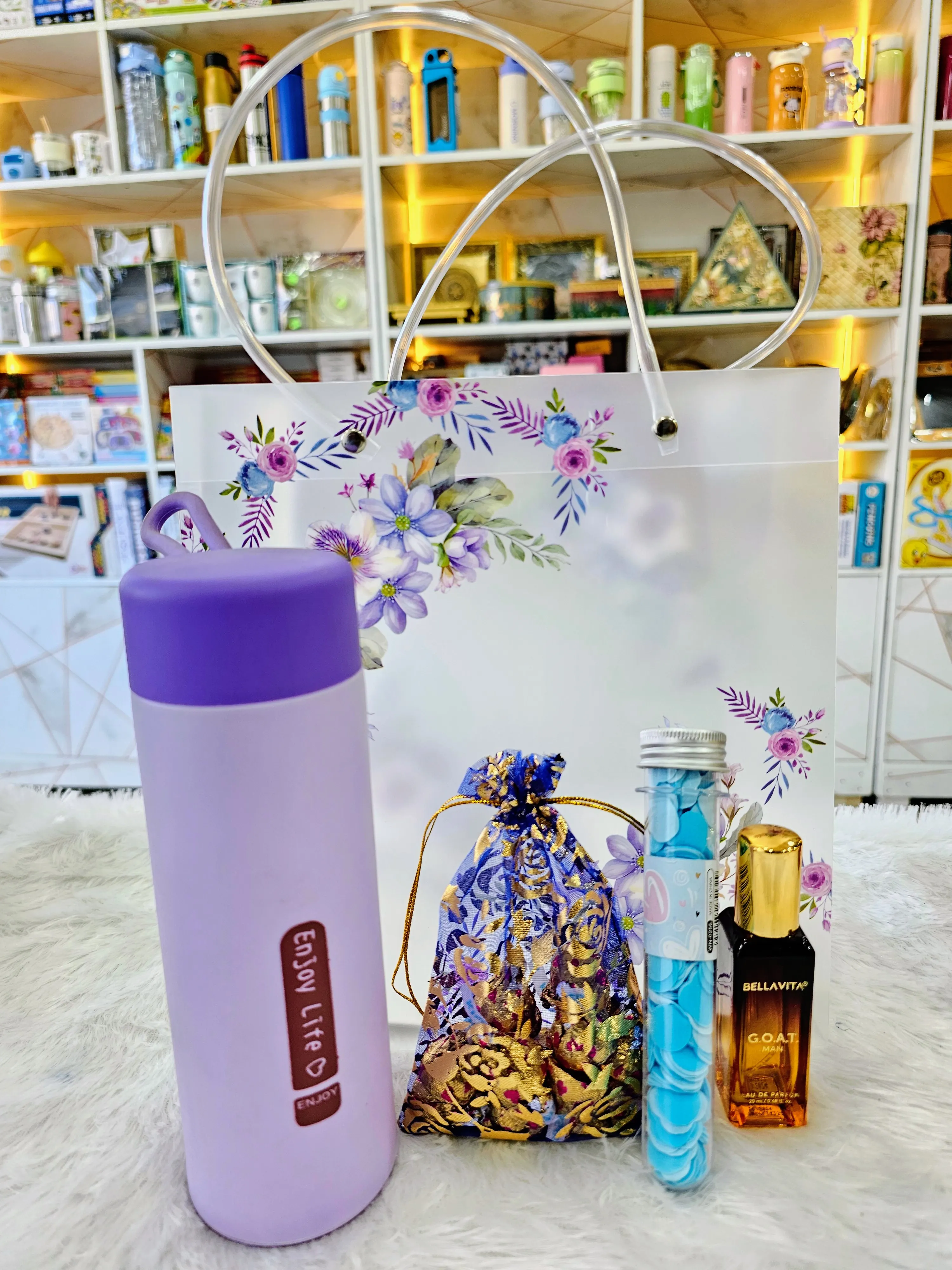 A stylish and thoughtful corporate gifting combo designed to refresh and delight. This set includes a premium galss bottle, a luxury mini perfume, a decorative chocolate potli, and a tube of soap tissues for everyday convenience.