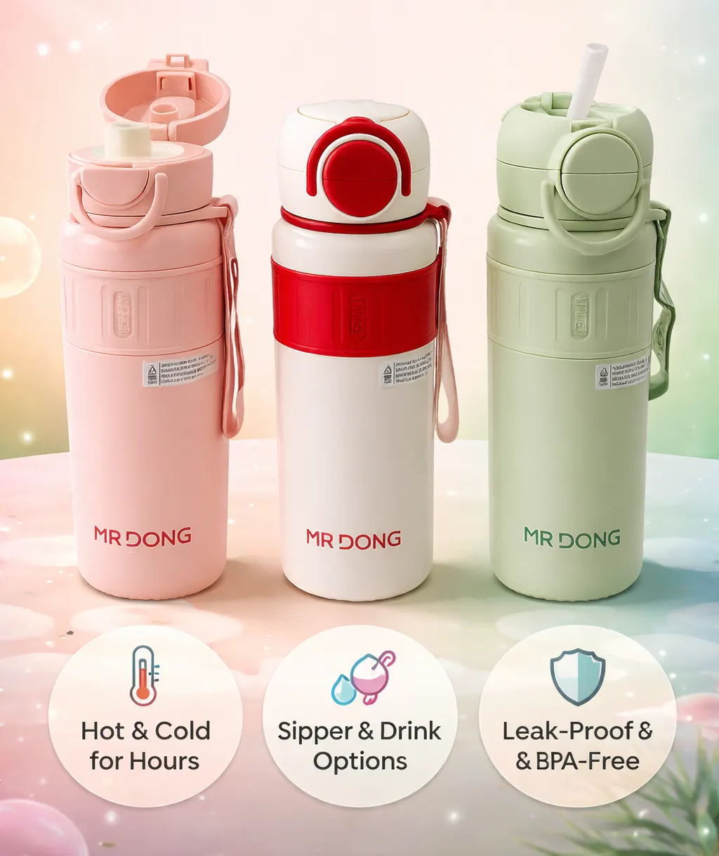 Premium stainless steel with a leak-proof vacuum seal. Powder-coated for better grip and durability. BPA-free, food-grade, and safe for everyday use. Perfect for spill-free hydration on the go. 💧✨