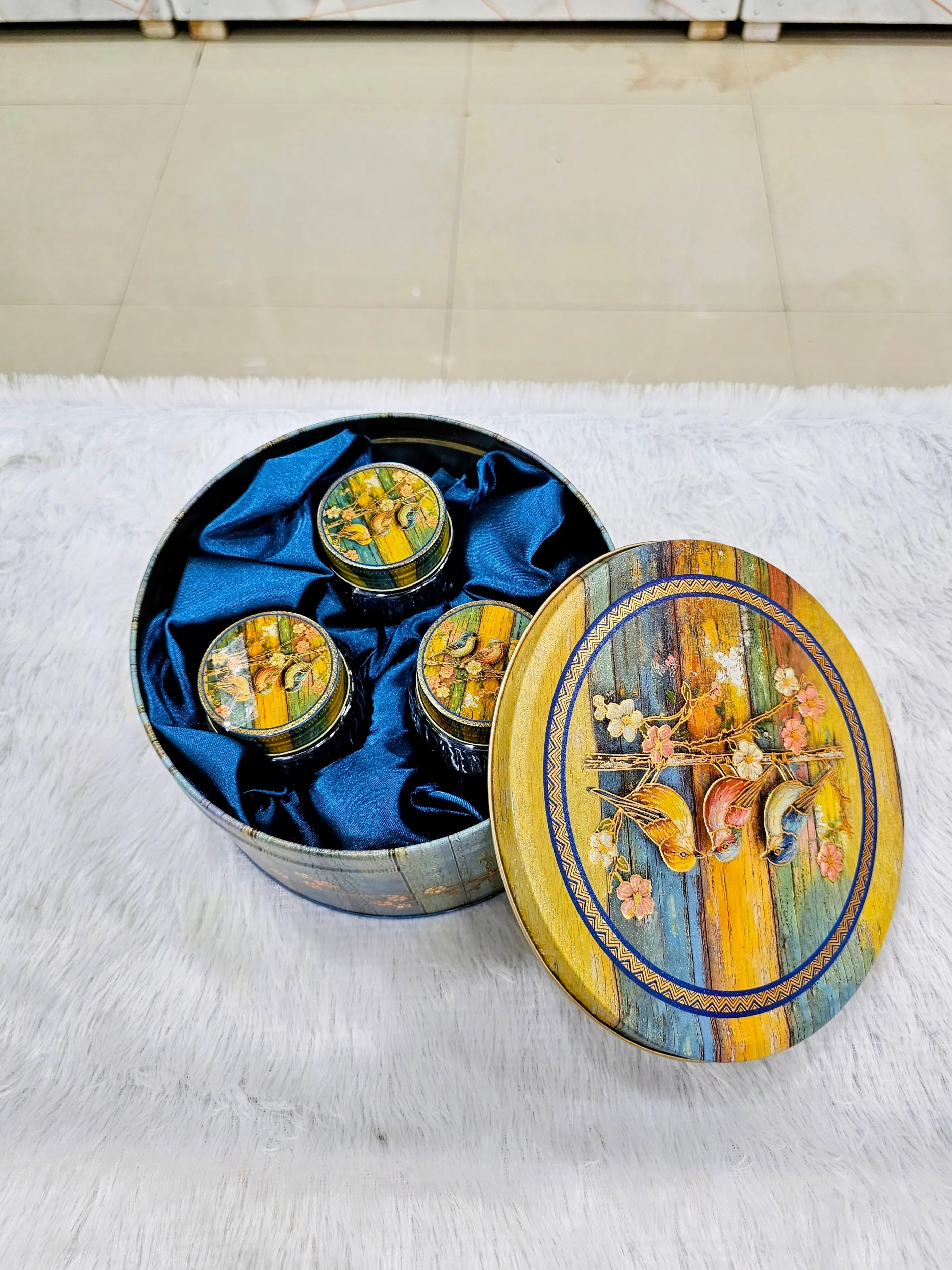 Beautiful 3 dry fruit jars with wooden box featuring elegant Meenakari print. A perfect combination of beauty and utility — ideal for pooja gifts, festivals, or home décor.
