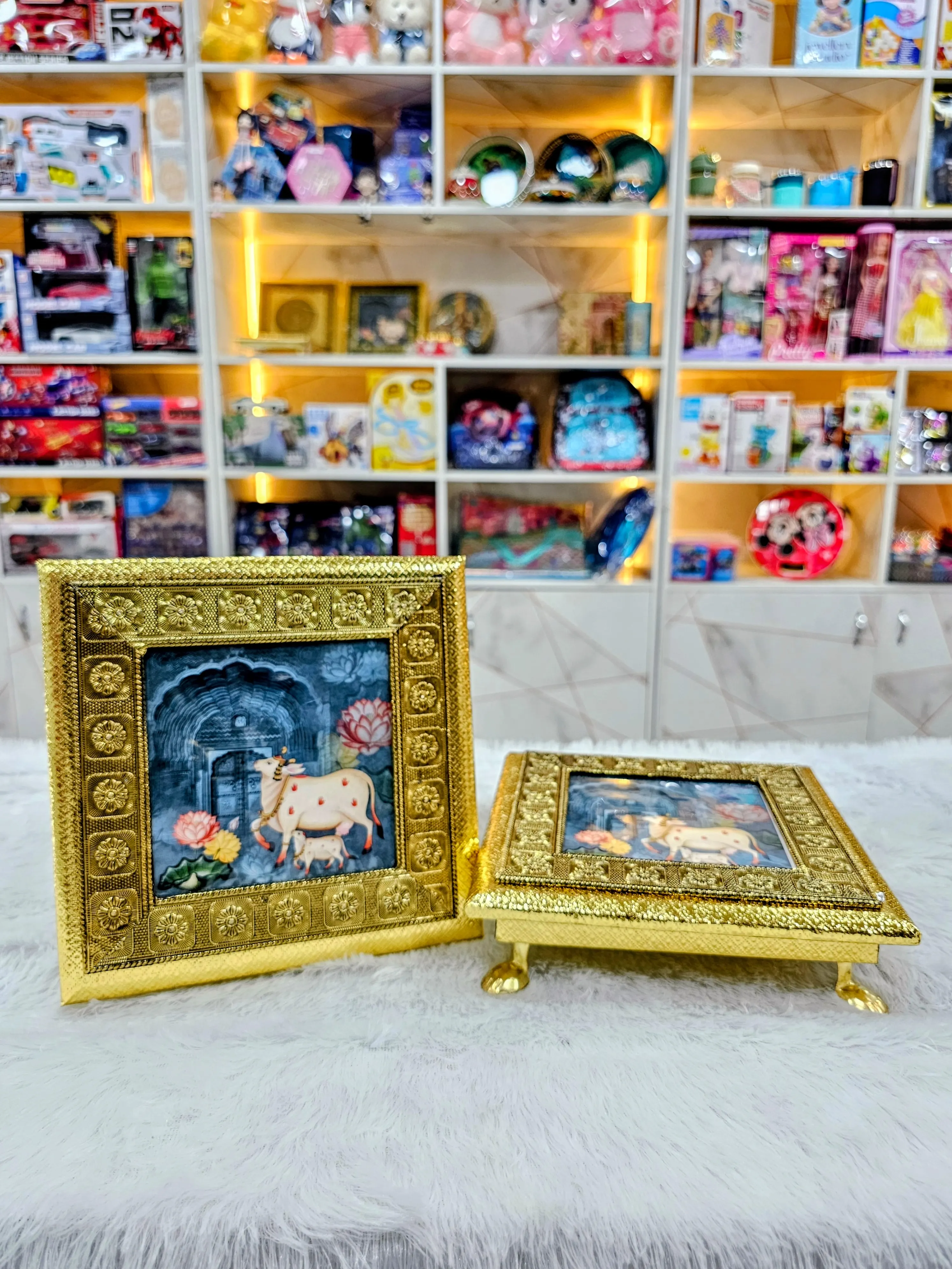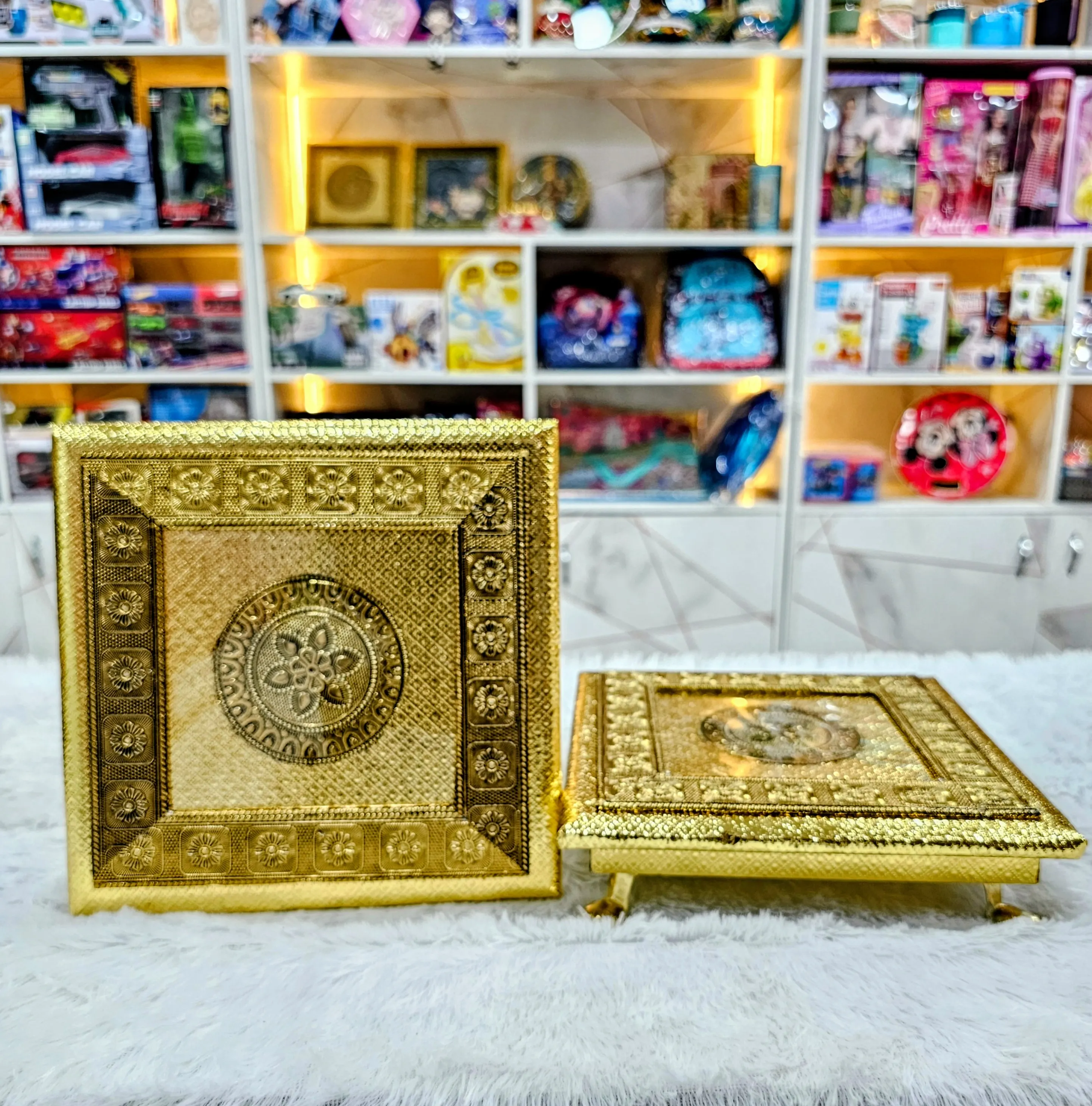 Beautifully crafted golden metal chowkis featuring intricate floral engravings and a royal embossed design. Perfect for pooja setups, gifting, or festive décor, these elegant stands add a traditional charm to your space and are ideal for placing idols, diyas, or return gift hampers.